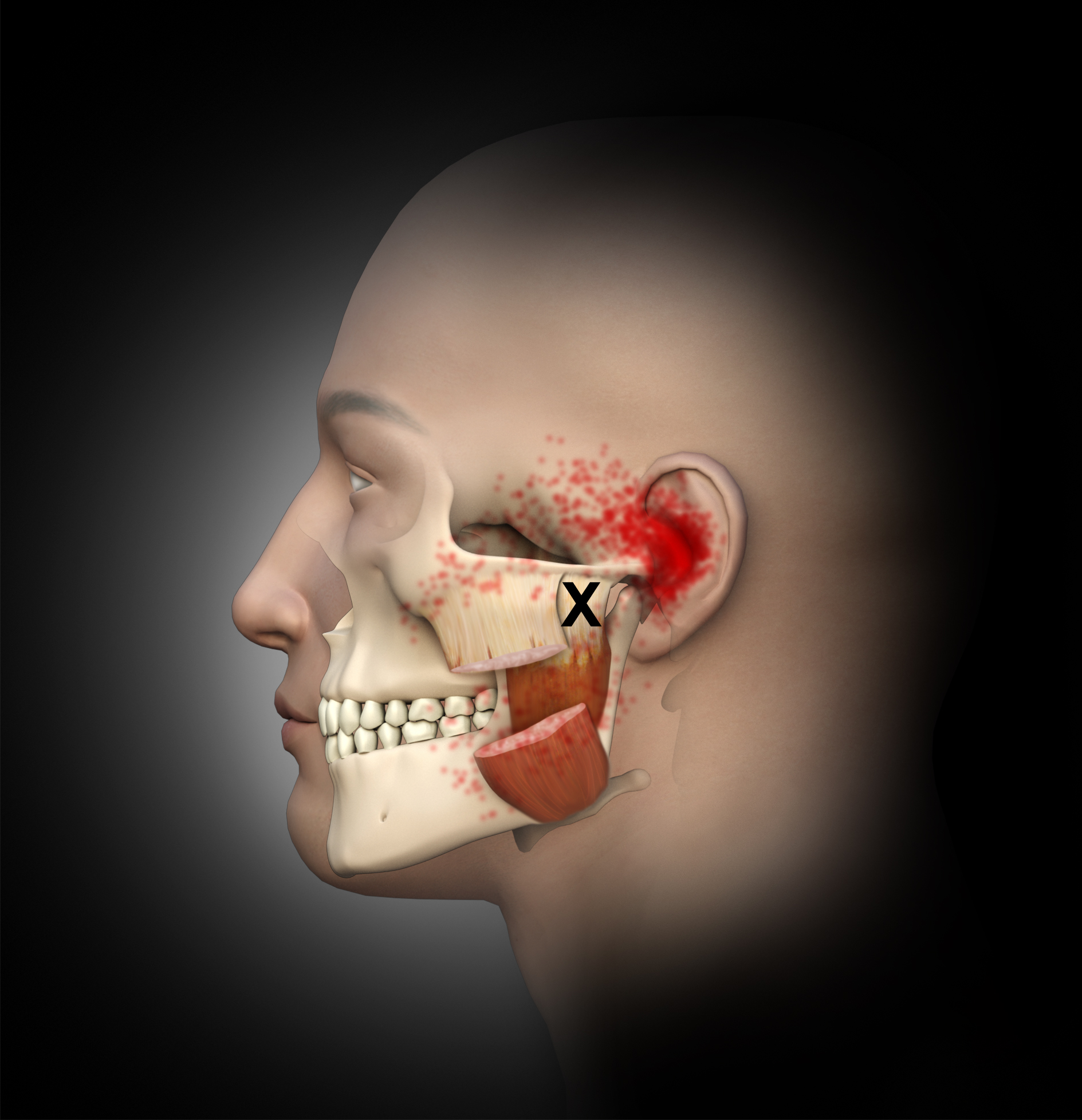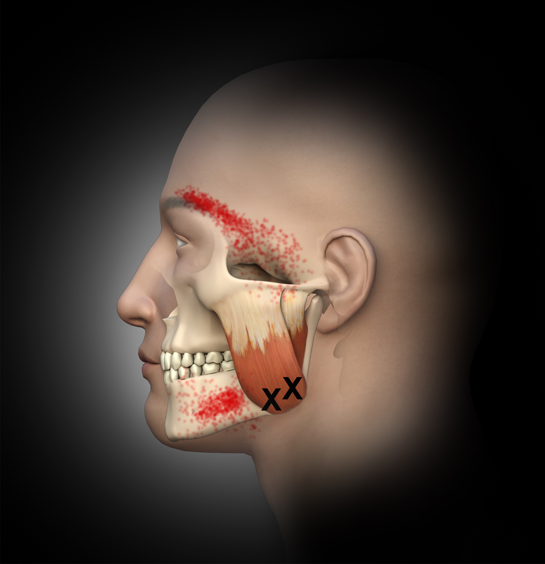 In general, masseter trigger points cause pain in the eye, face, jaw, and teeth. An unexplained earache can be a result of masseter trigger points, and research by Simons et al12 reports trigger points of the masseter can even cause an itch deep in the ear. Trigger points in the deep layer of the masseter may also be a cause of tinnitus (ringing noise in the ear with no cause). Figure 1 through Figure 3 illustrate trigger points in masseter muscle and the common referral patterns (shown in red).12 It is important to note that the facial nerve is a motor nerve that innervates the muscles of facial expression. Care should be taken to know the facial nerve anatomy when treating trigger points in the deep masseter near the zygomatic arch.